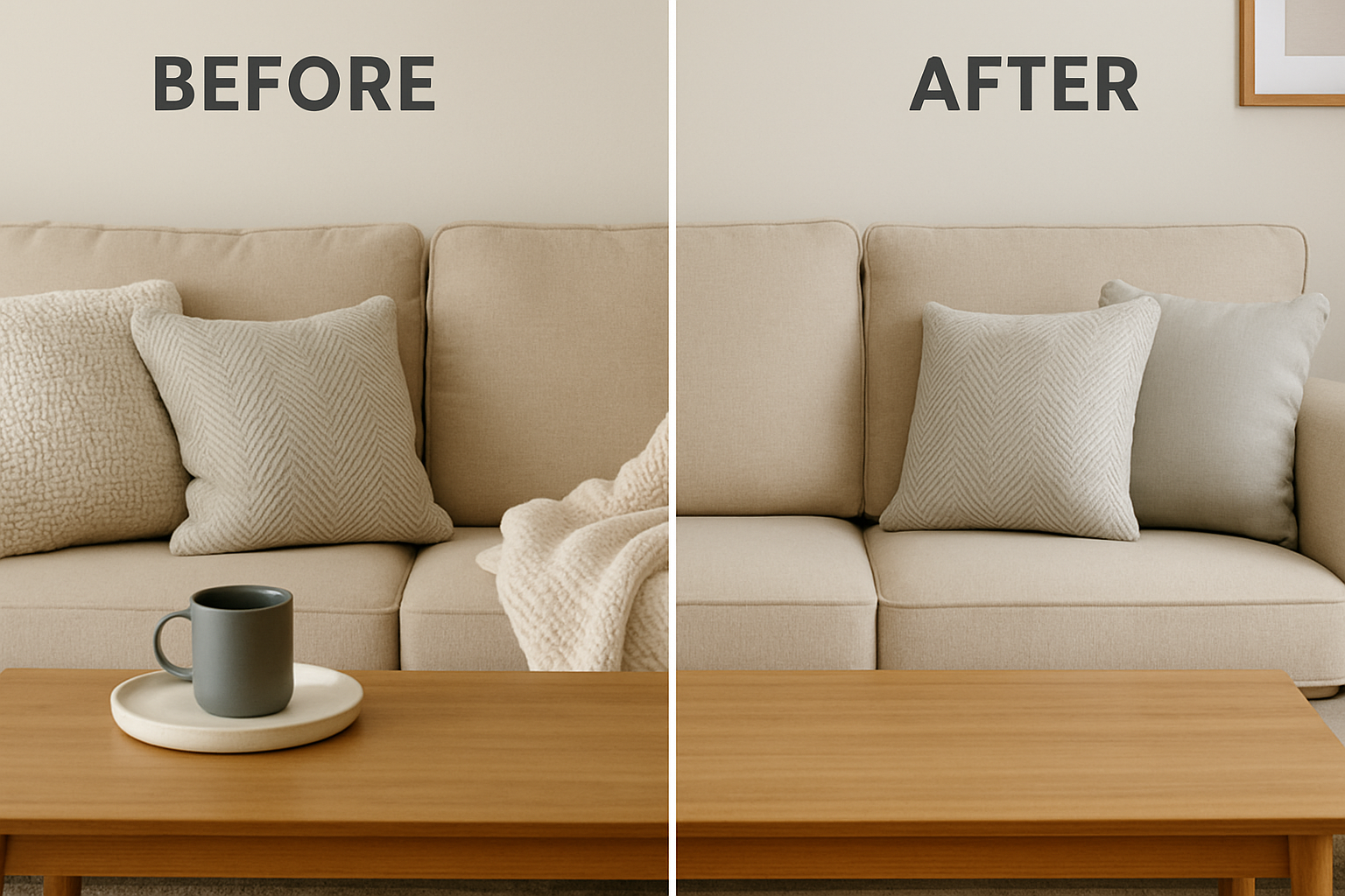 Before and after of a living room corner showing professional finishing touches like aligned pillows and a folded throw blanket